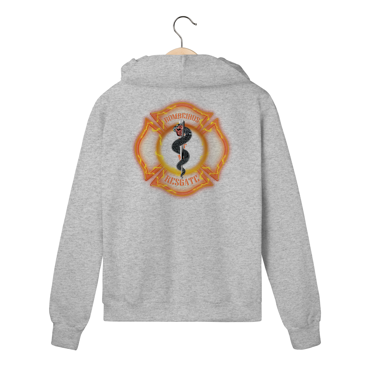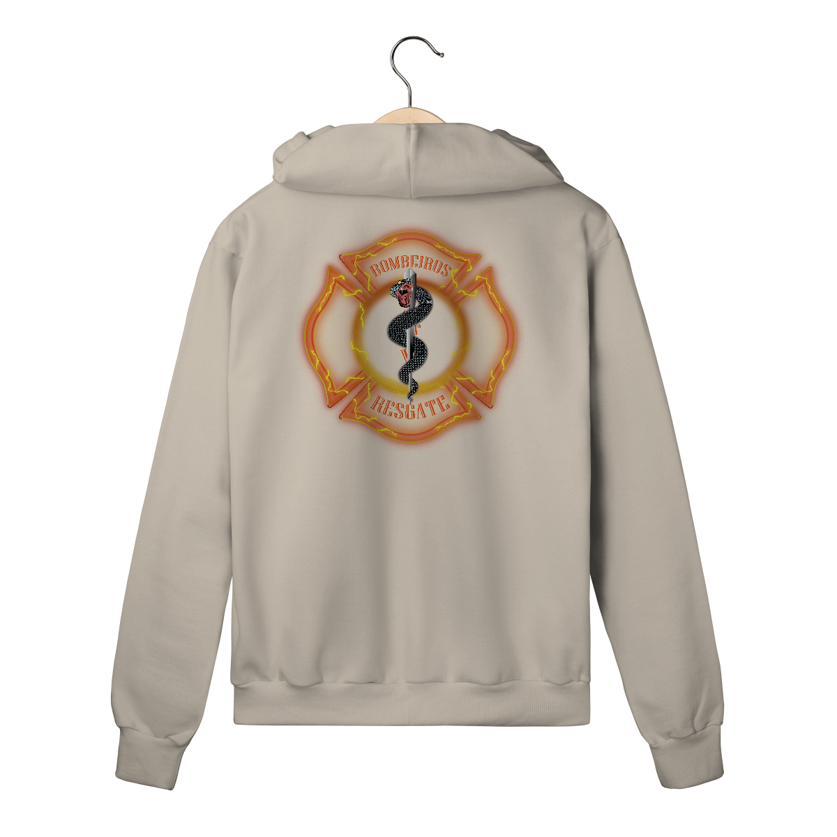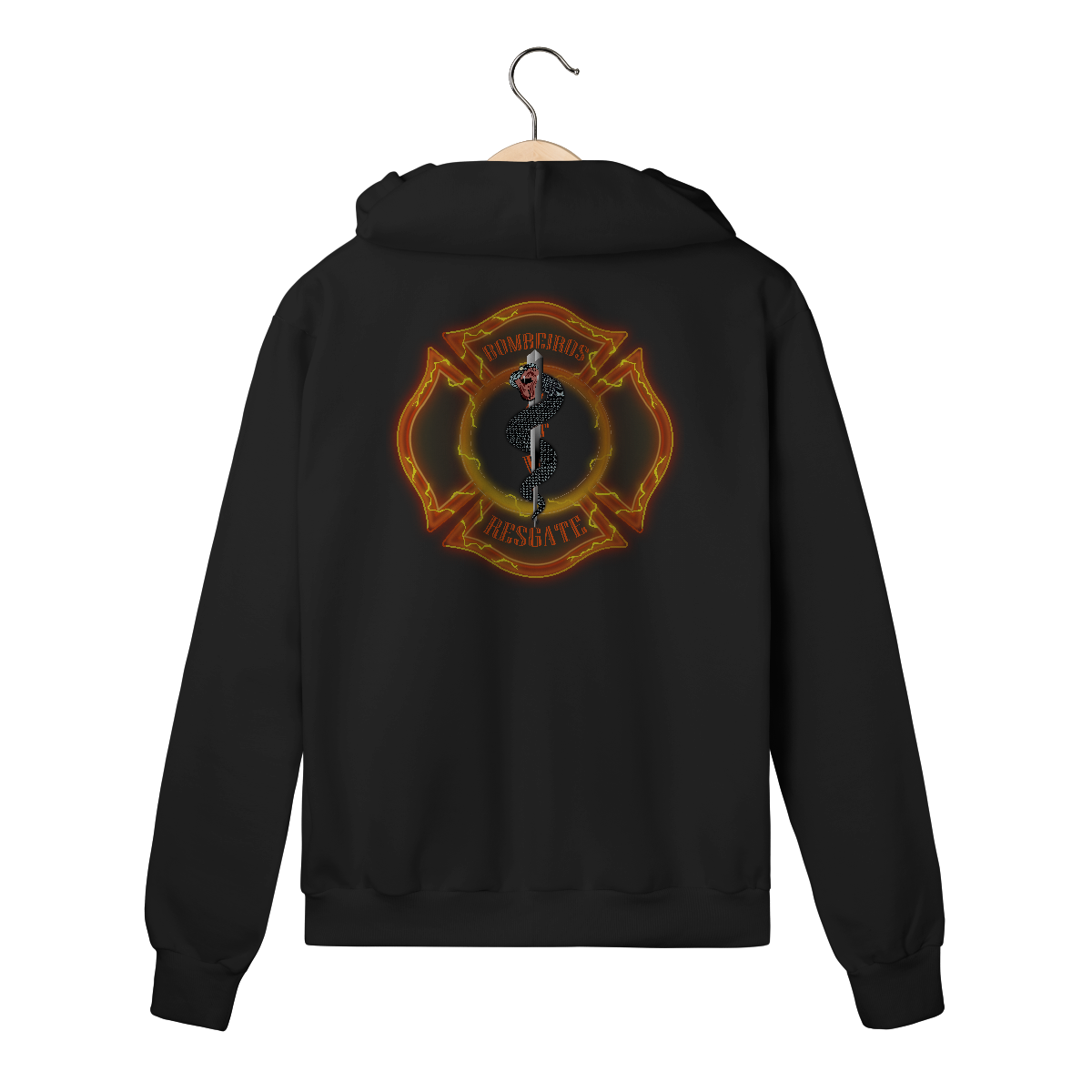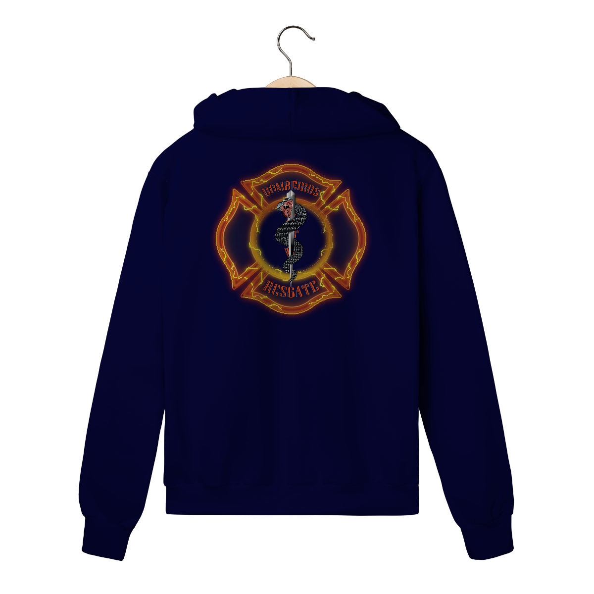 • Texto “BOMBEIROS RESGATE” em tipografia curva e forte, nas partes superior e inferior da cruz.