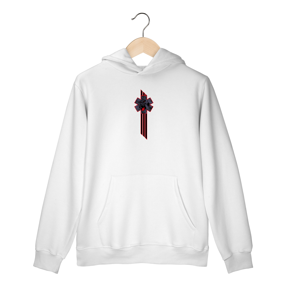 • No centro, o tradicional símbolo do bastão de Asclépio, representado por uma espada metálica vertical com uma cobra preta enrolada, de cabeça ameaçadora.