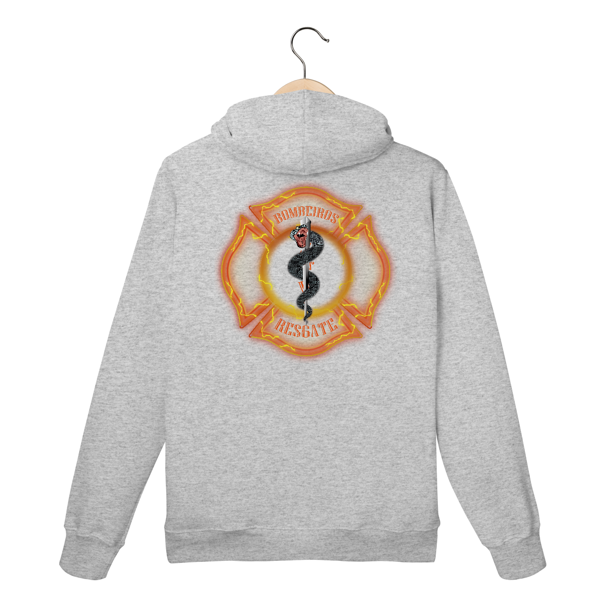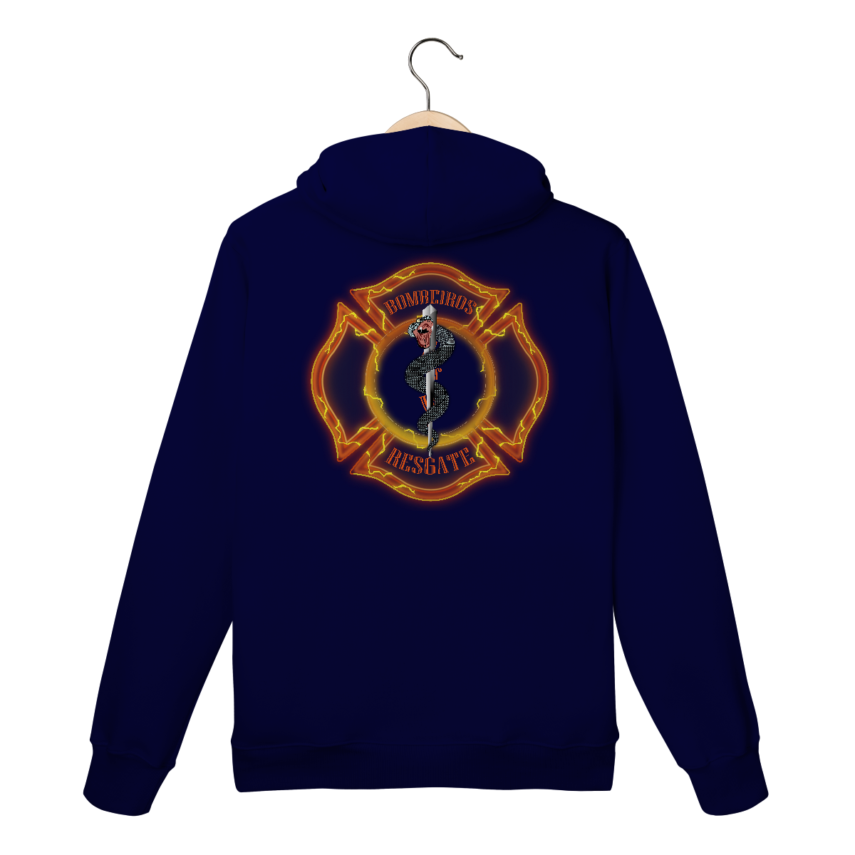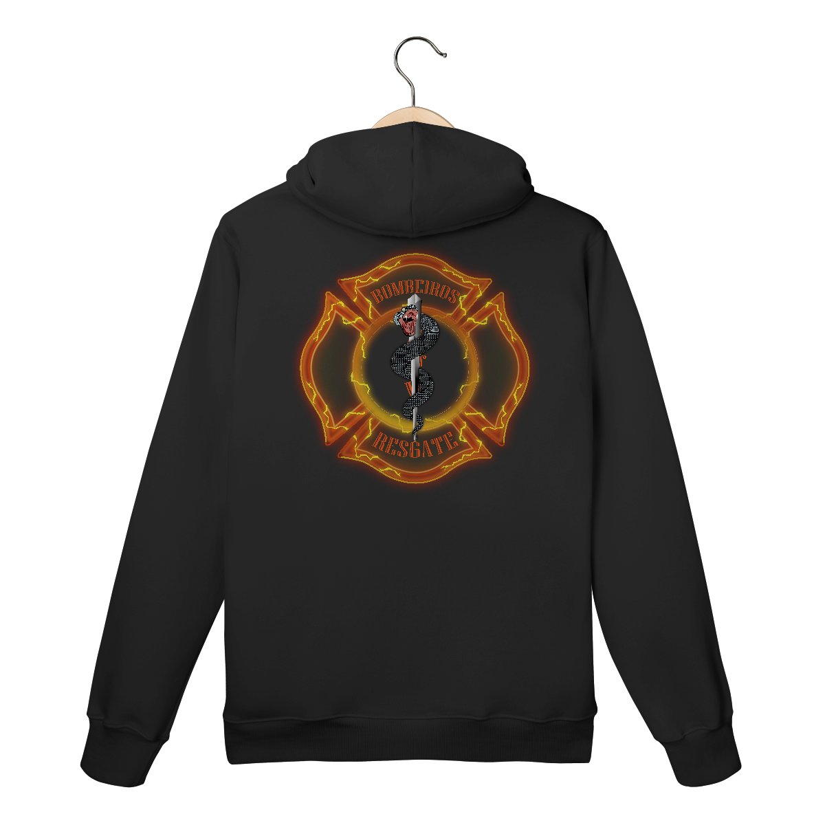 • Texto “BOMBEIROS RESGATE” em tipografia curva e forte, nas partes superior e inferior da cruz.