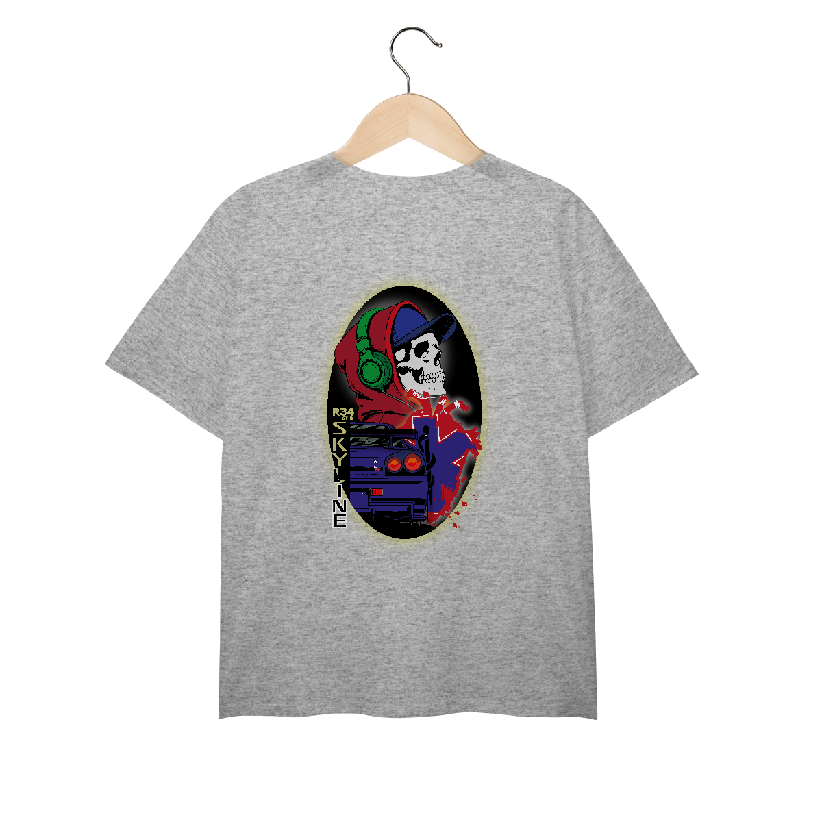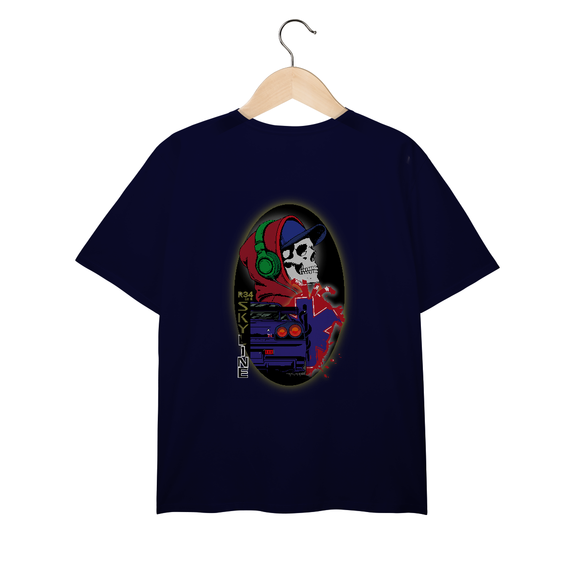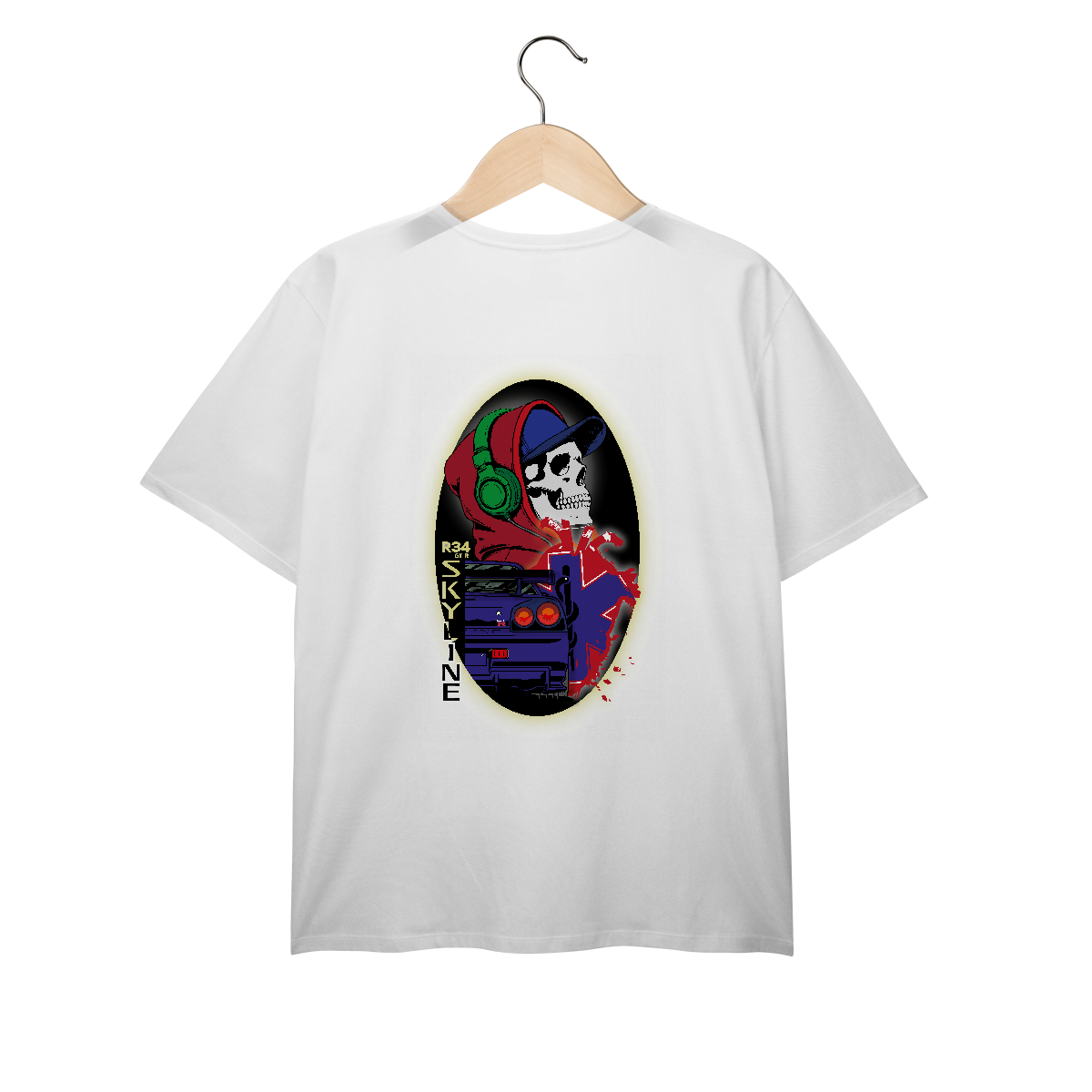 Essa estampa explosiva mistura o universo underground urbano com a velocidade das pistas e a vibe streetwear. Ao centro, um crânio estilizado com fone verde, moletom vermelho e boné azul expressa a identidade de quem vive no limite — com o volume no máximo e adrenalina nas veias.