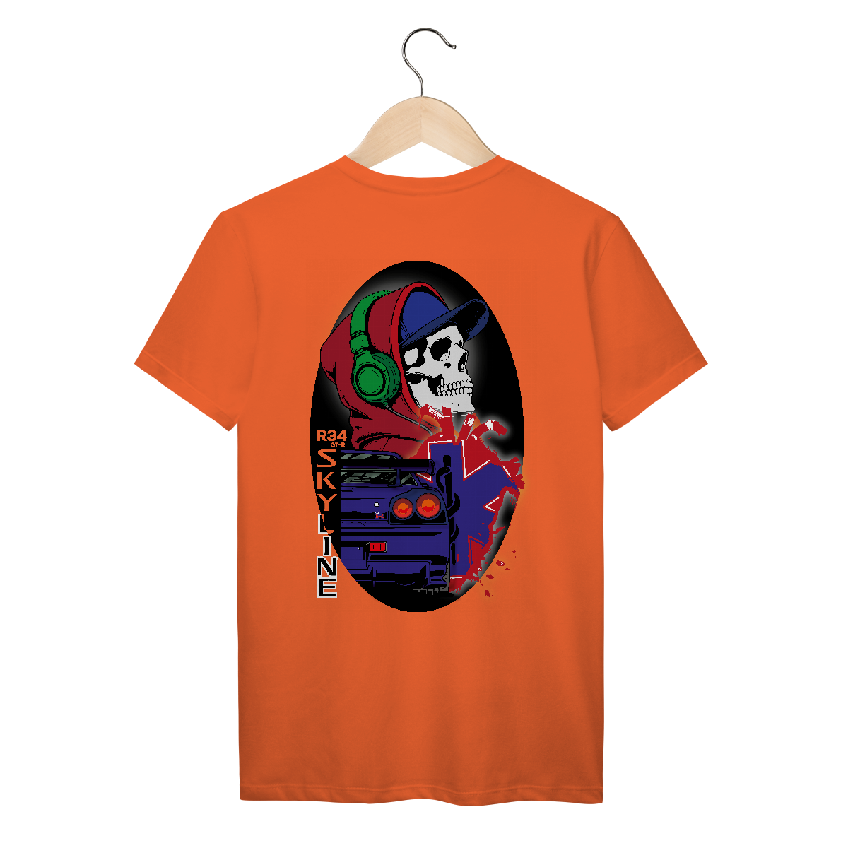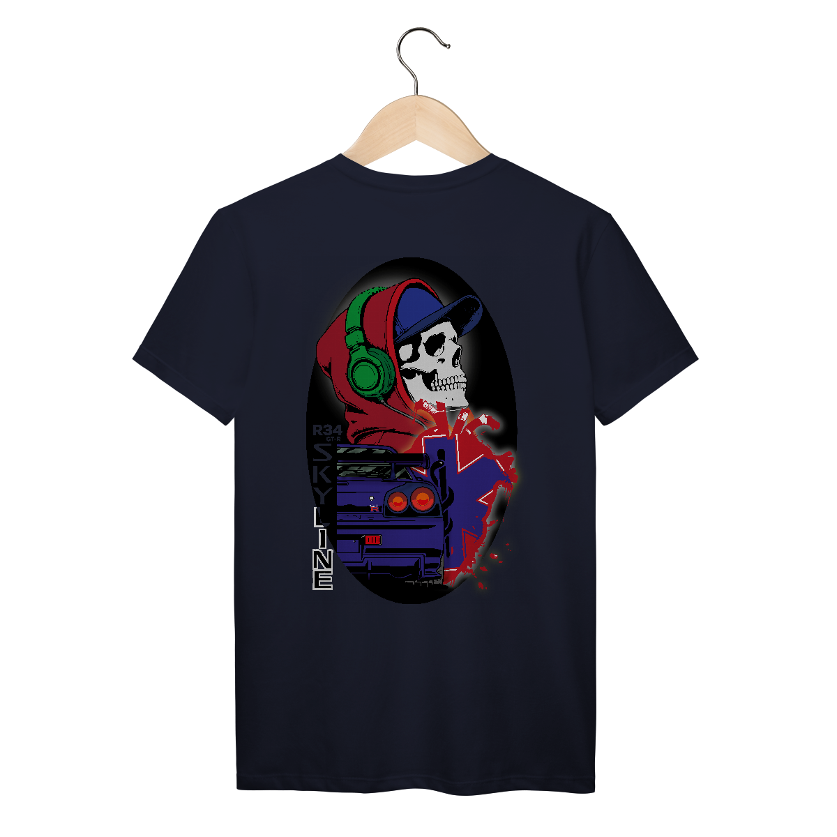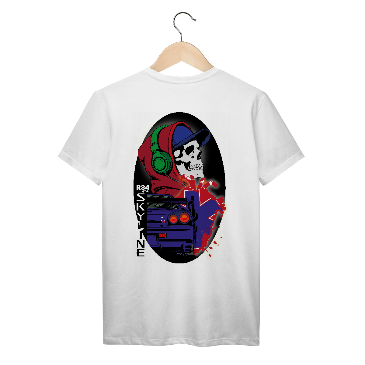Essa estampa explosiva mistura o universo underground urbano com a velocidade das pistas e a vibe streetwear. Ao centro, um crânio estilizado com fone verde, moletom vermelho e boné azul expressa a identidade de quem vive no limite — com o volume no máximo e adrenalina nas veias.