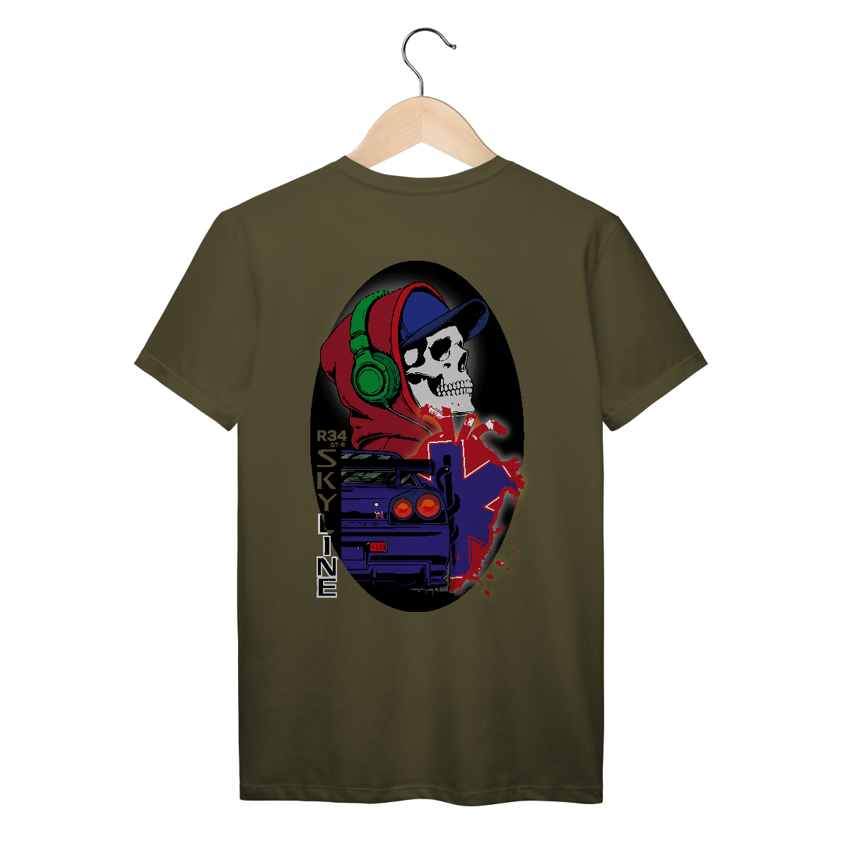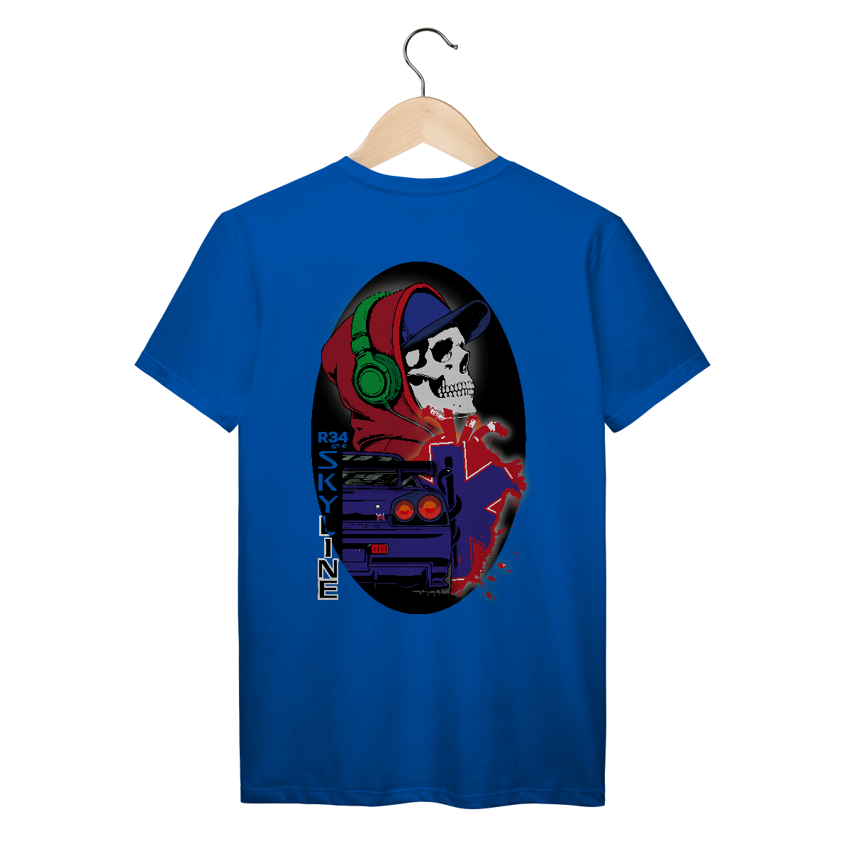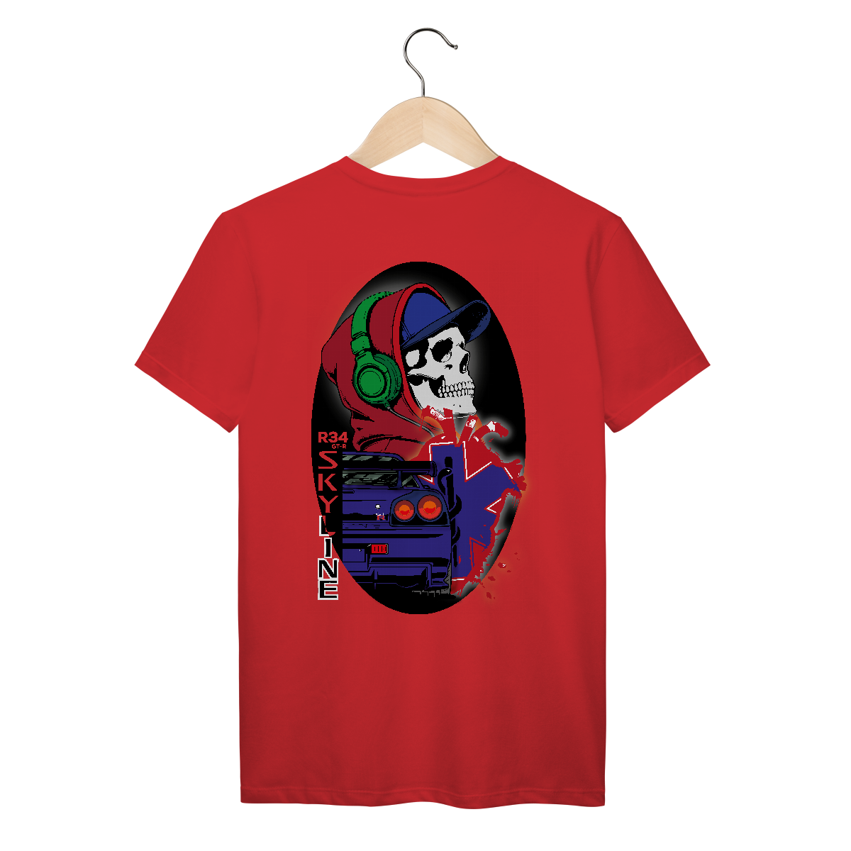 Essa estampa explosiva mistura o universo underground urbano com a velocidade das pistas e a vibe streetwear. Ao centro, um crânio estilizado com fone verde, moletom vermelho e boné azul expressa a identidade de quem vive no limite — com o volume no máximo e adrenalina nas veias.