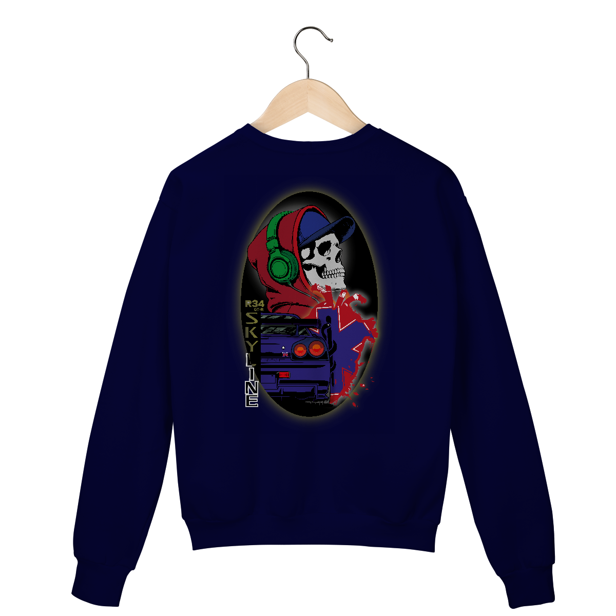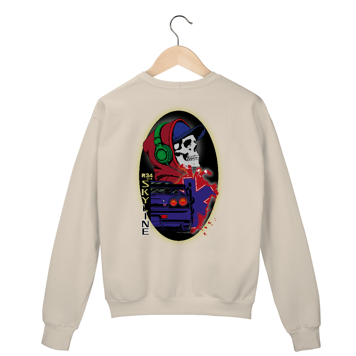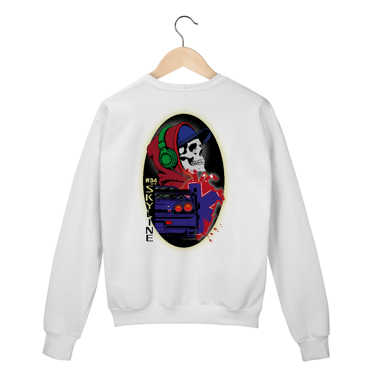 Essa estampa explosiva mistura o universo underground urbano com a velocidade das pistas e a vibe streetwear. Ao centro, um crânio estilizado com fone verde, moletom vermelho e boné azul expressa a identidade de quem vive no limite — com o volume no máximo e adrenalina nas veias.