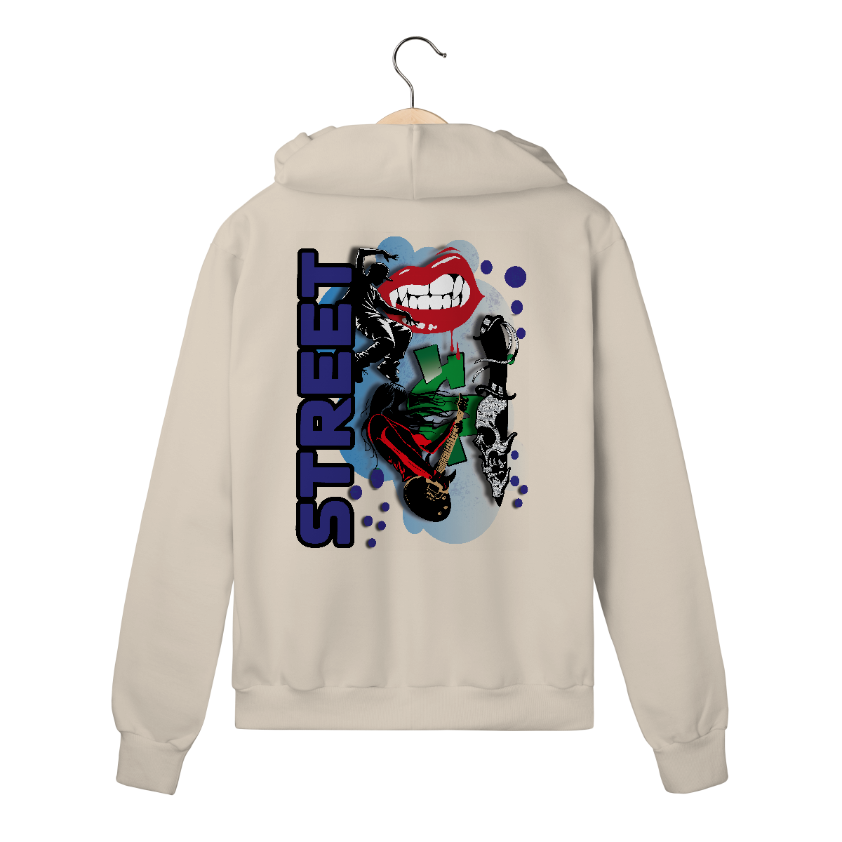 Ao centro, a palavra “STREET” surge em destaque na vertical com tipografia bold em roxo, simbolizando o pilar da cena urbana. A silhueta de um dançarino de street dance traz movimento e energia, enquanto a guitarrista headbanger representa a fusão entre o rock e o espírito underground.
