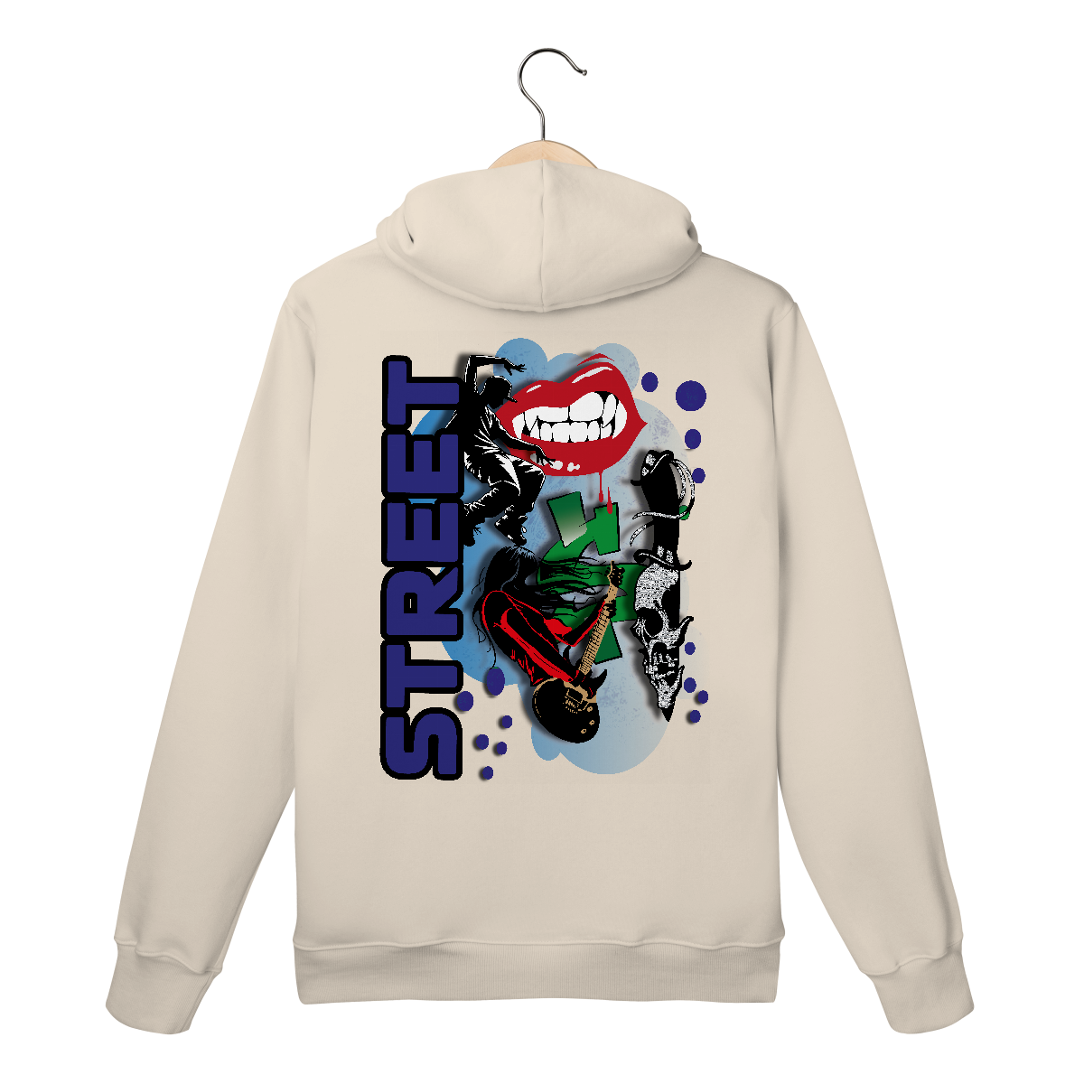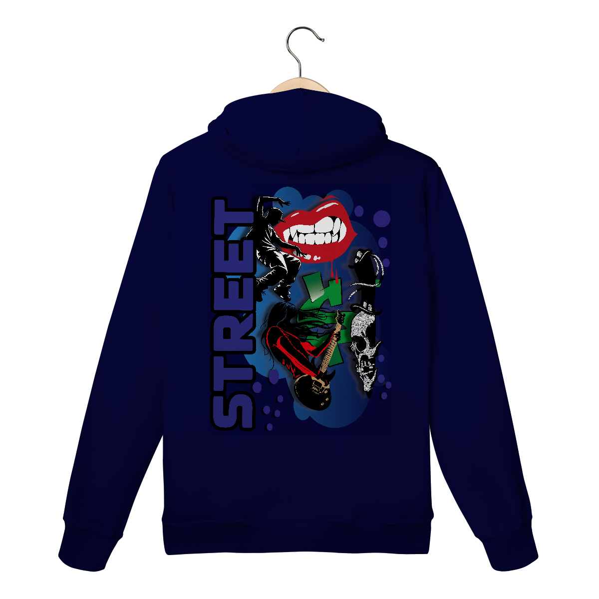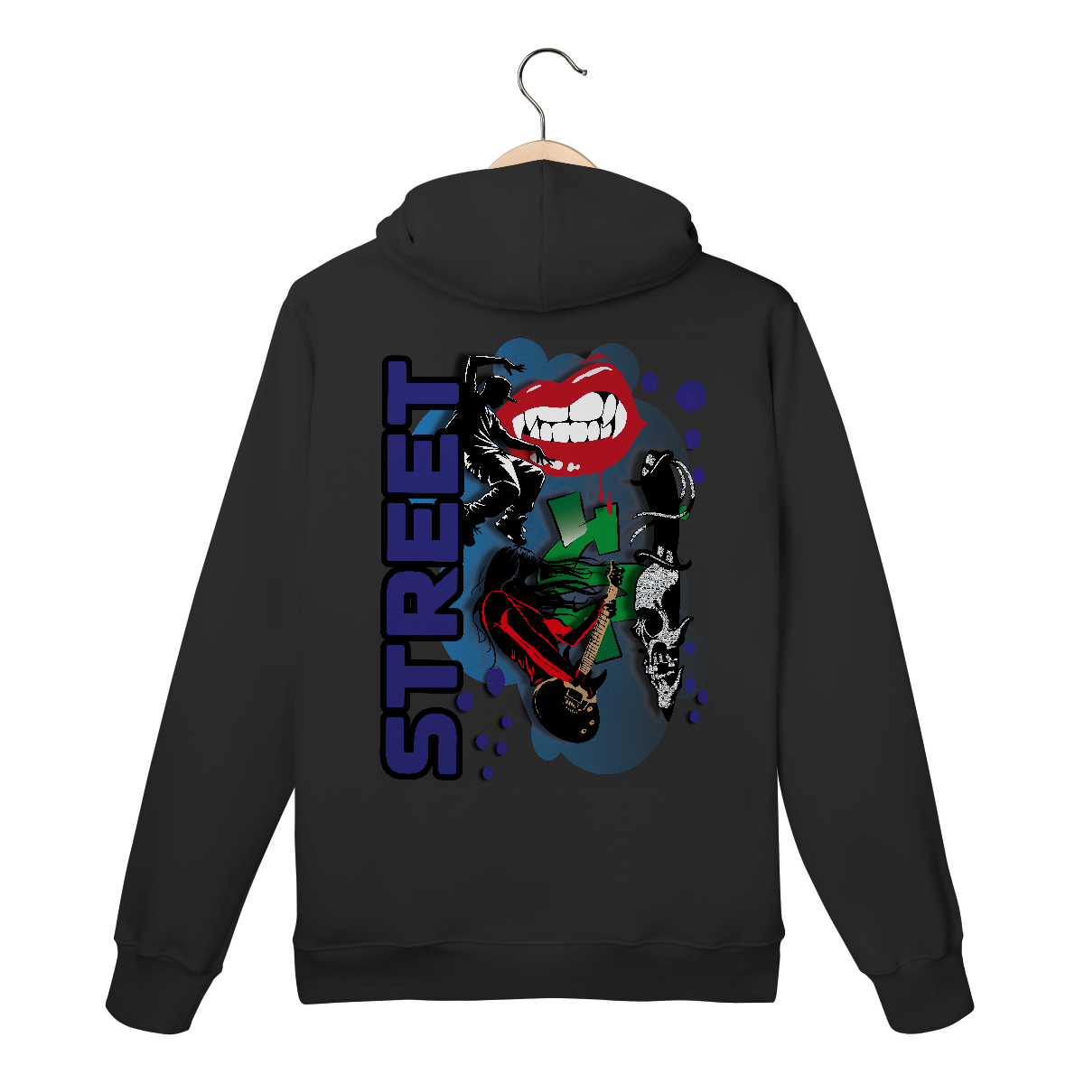 Ao centro, a palavra “STREET” surge em destaque na vertical com tipografia bold em roxo, simbolizando o pilar da cena urbana. A silhueta de um dançarino de street dance traz movimento e energia, enquanto a guitarrista headbanger representa a fusão entre o rock e o espírito underground.