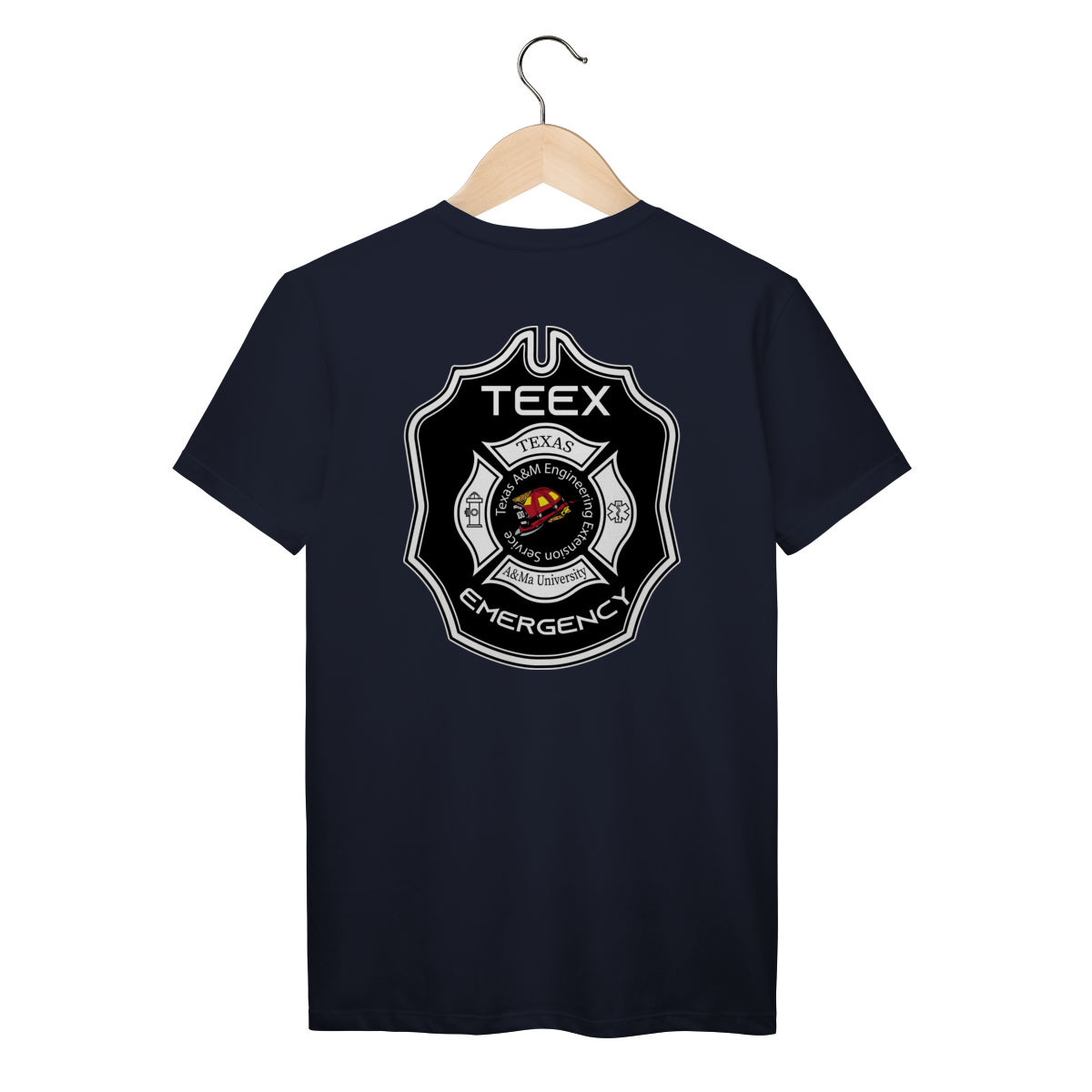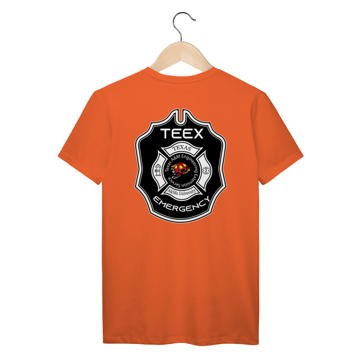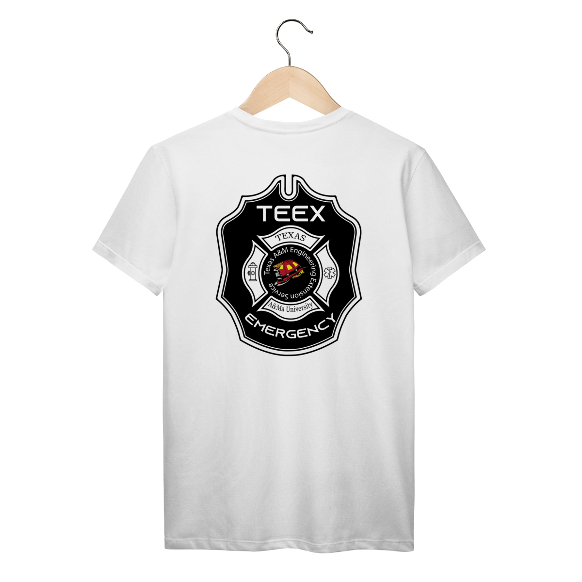 A camiseta TEEX Emergency é inspirada no emblema oficial da Texas A&M Engineering Extension Service, referência mundial em treinamentos de bombeiros, resgate e serviços de emergência.