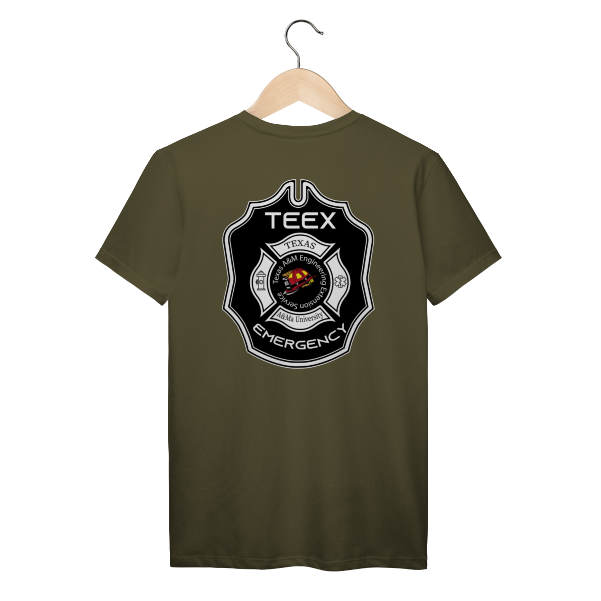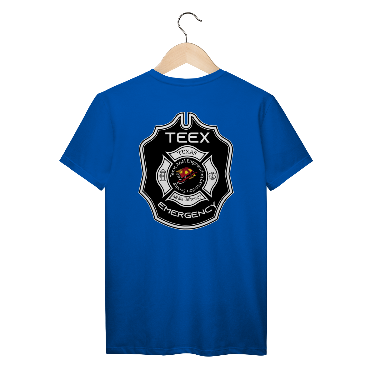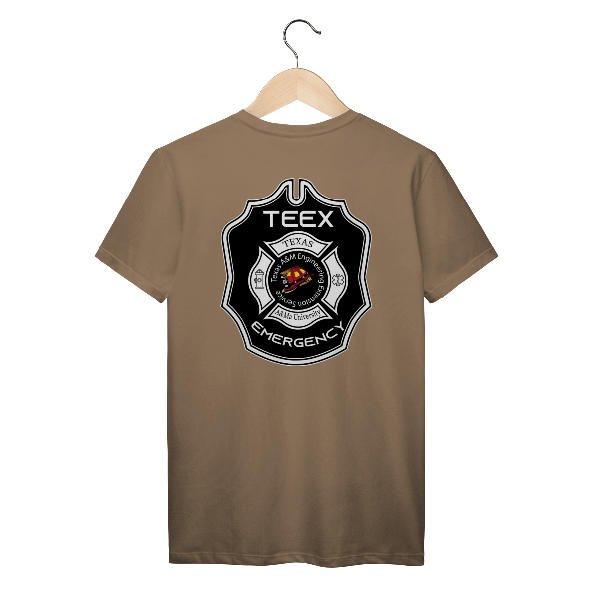 A camiseta TEEX Emergency é inspirada no emblema oficial da Texas A&M Engineering Extension Service, referência mundial em treinamentos de bombeiros, resgate e serviços de emergência.