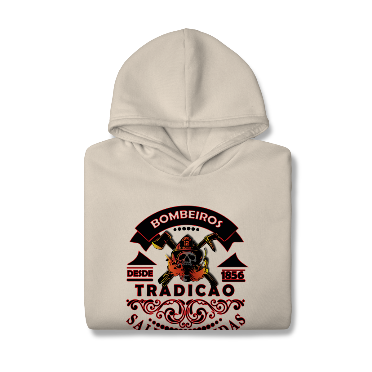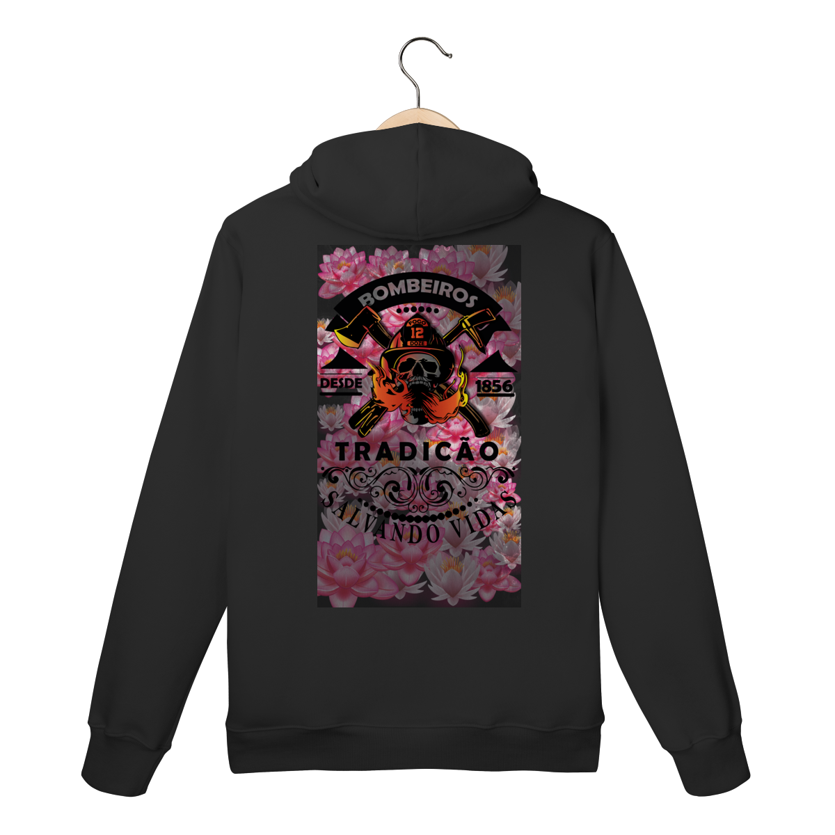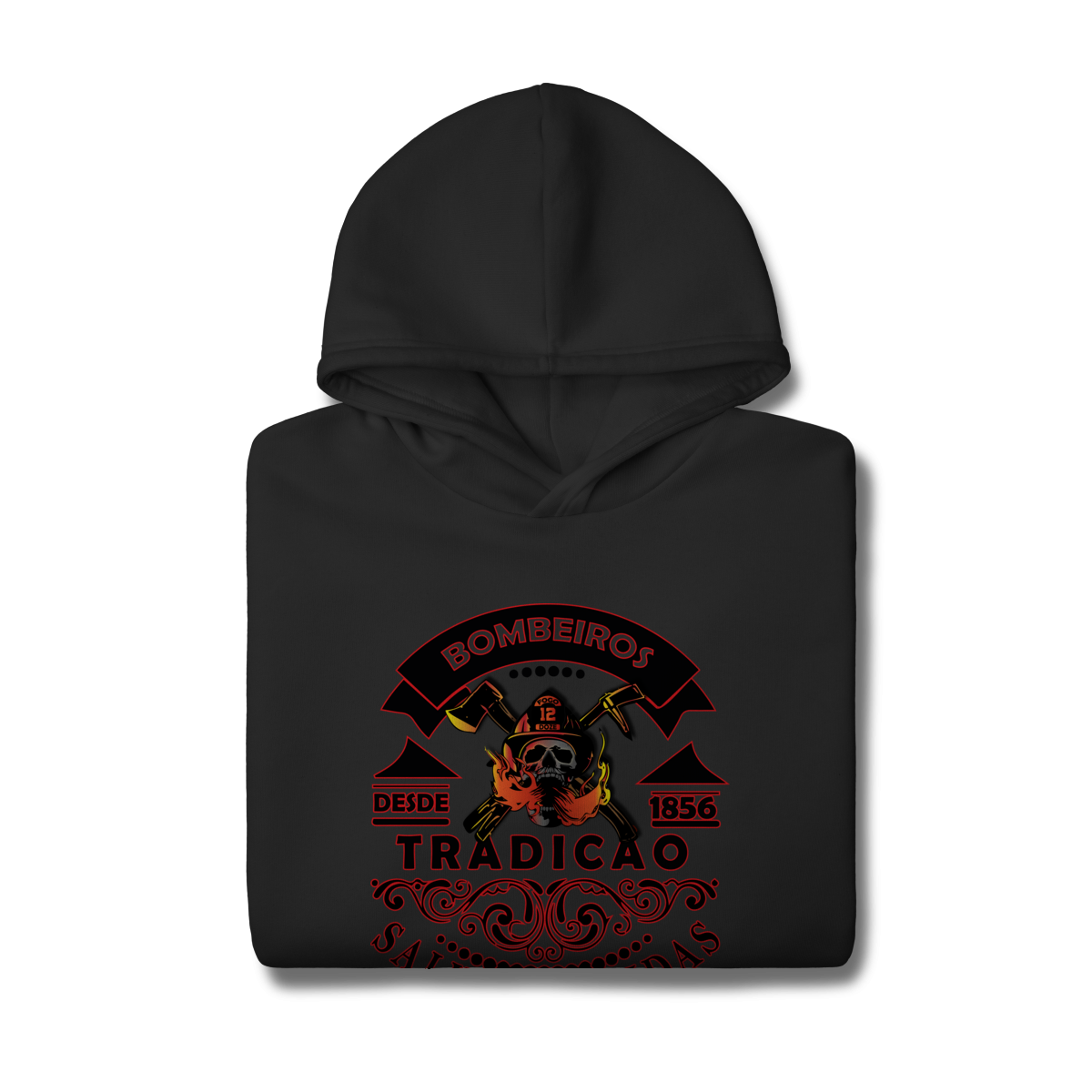 A estampa “Tradição – Salvando Vidas desde 1856” é uma homenagem à bravura e ao legado dos bombeiros. Com um design marcante que combina força, tradição e coragem, ela traz a caveira com capacete, machados cruzados e chamas em destaque, representando a luta diária contra o fogo.