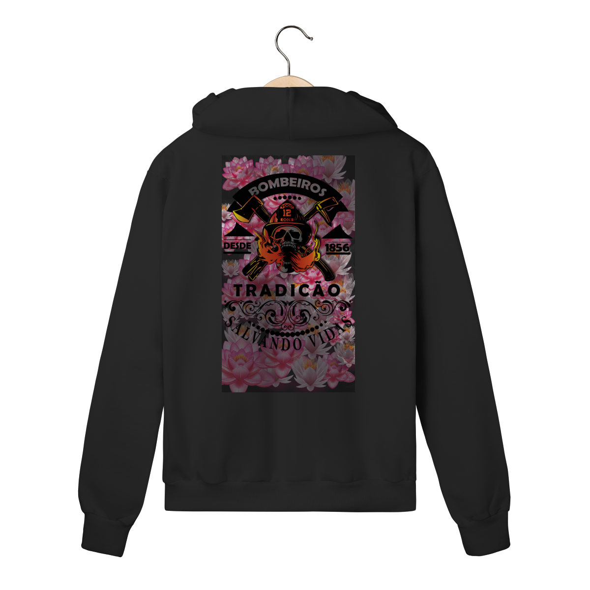 A estampa “Tradição – Salvando Vidas desde 1856” é uma homenagem à bravura e ao legado dos bombeiros. Com um design marcante que combina força, tradição e coragem, ela traz a caveira com capacete, machados cruzados e chamas em destaque, representando a luta diária contra o fogo.