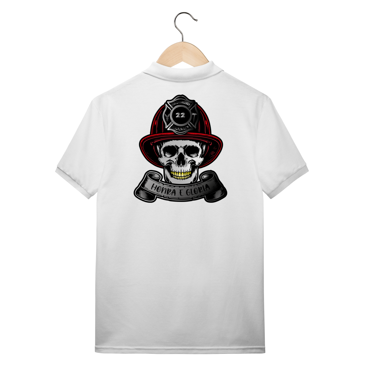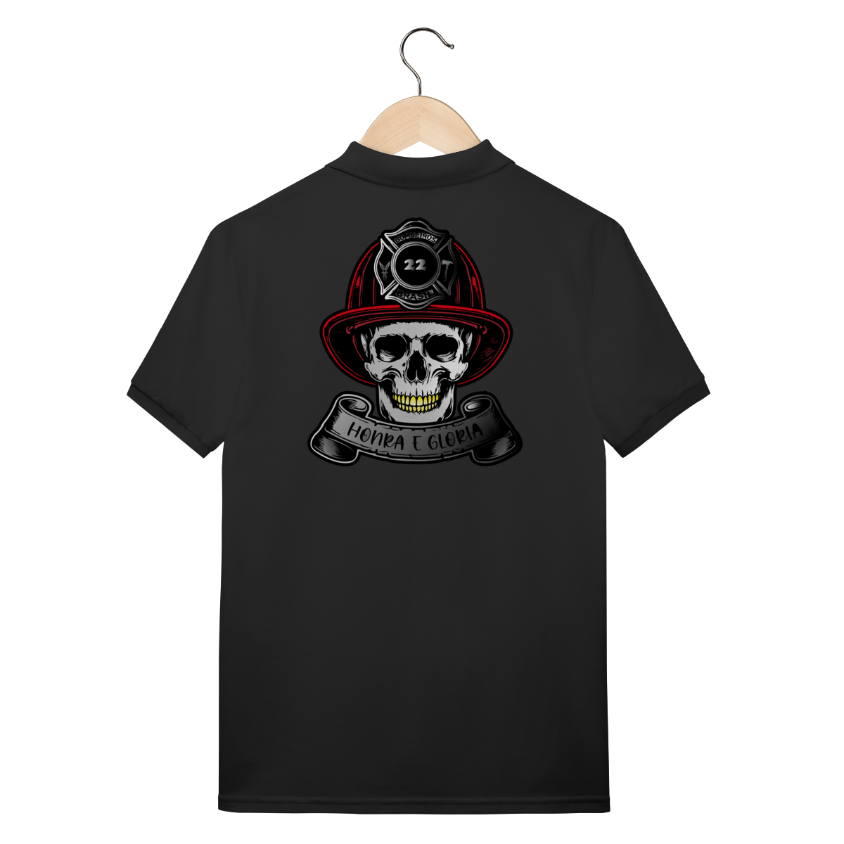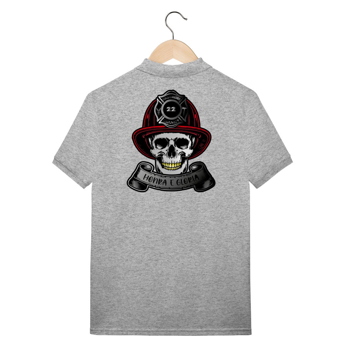 A caveira com o capacete clássico simboliza bravura eterna e respeito aos que enfrentam o fogo todos os dias.