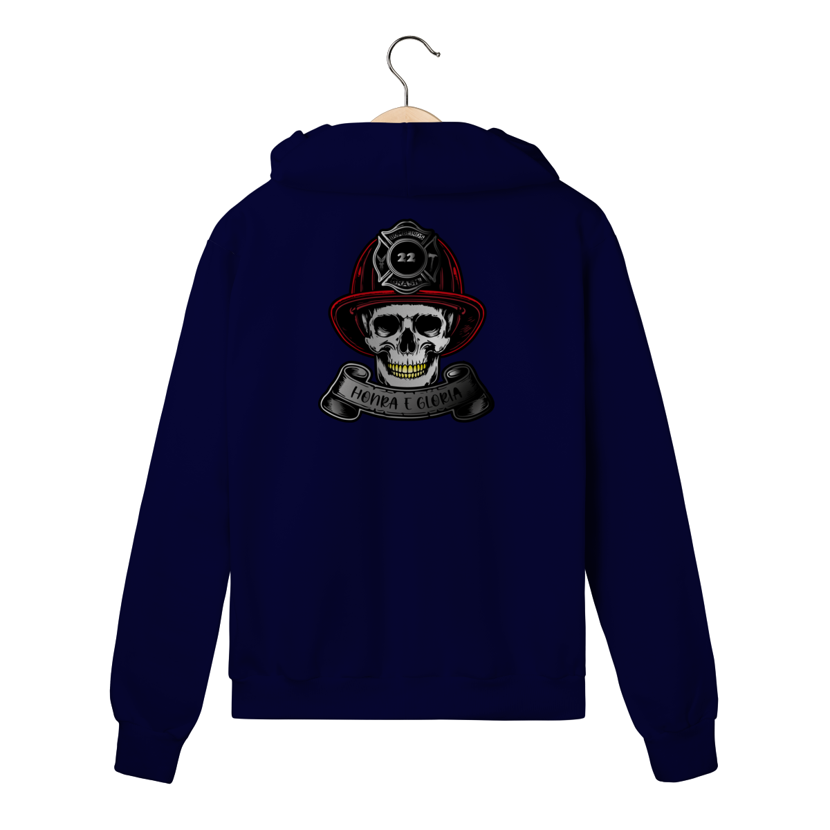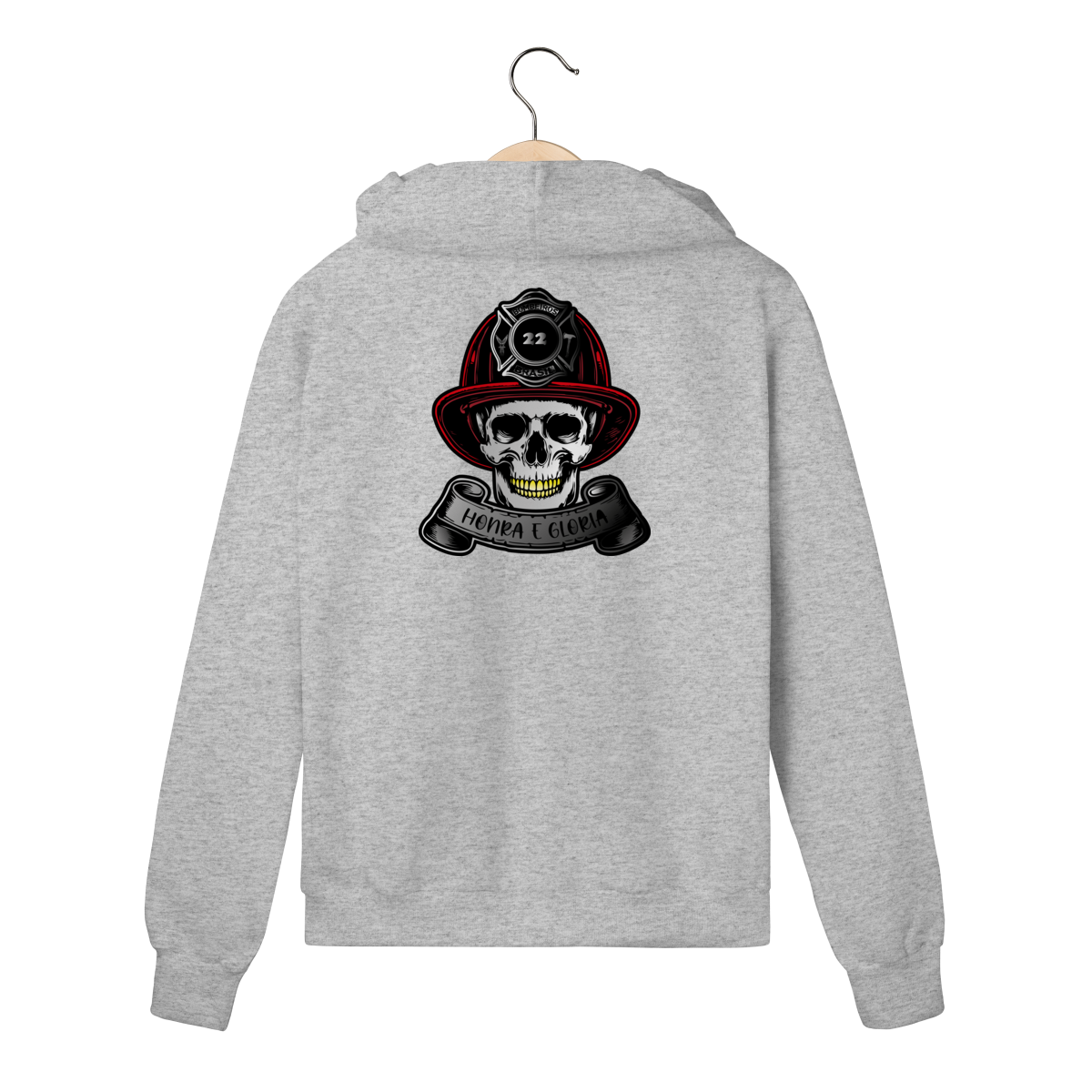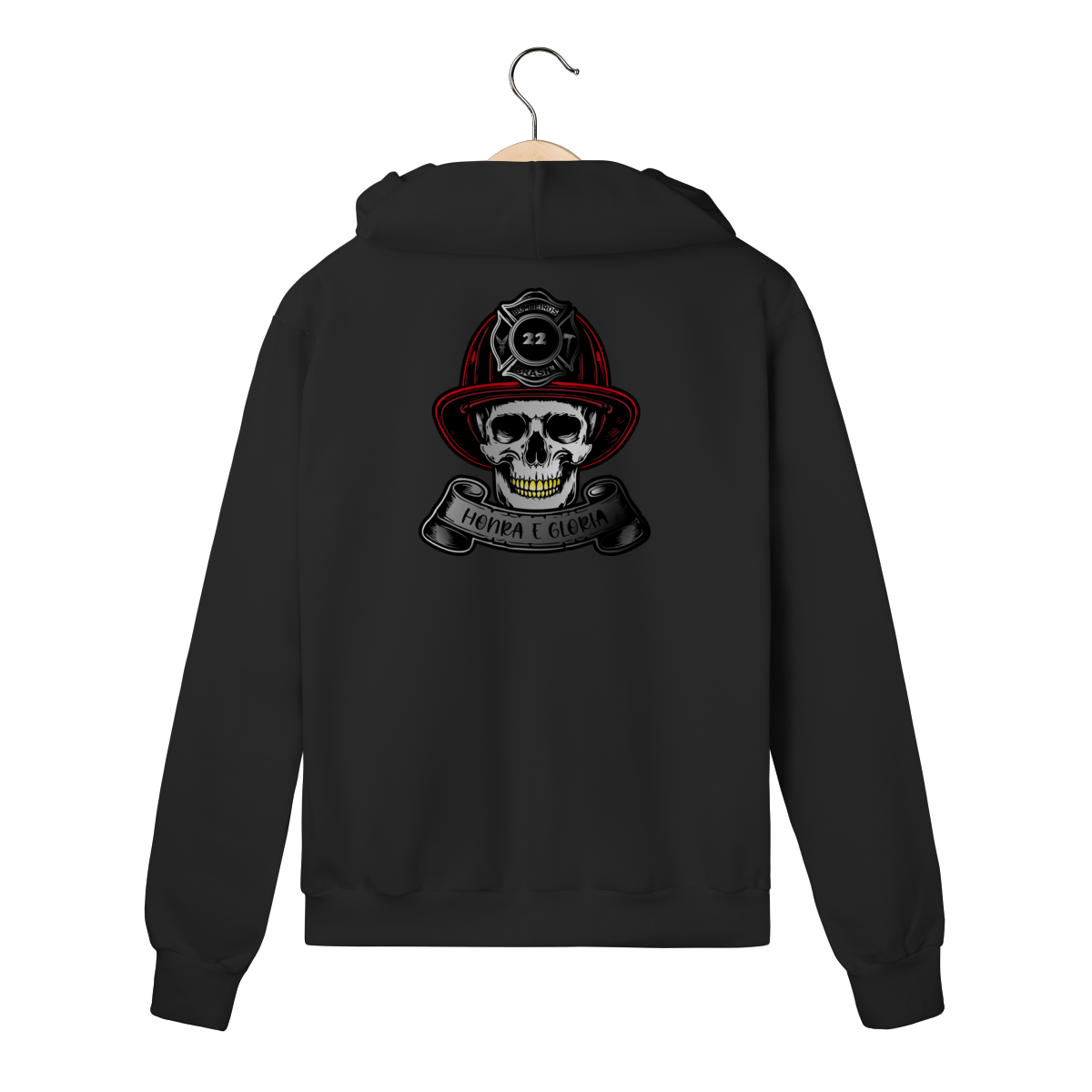 A caveira com o capacete clássico simboliza bravura eterna e respeito aos que enfrentam o fogo todos os dias.